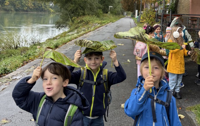 Wandertag der 1. und 2. Klassen Die Kinder der Klassen 1a, 1b und 2 der Grundschule St. Nikola unternahmen eine Wanderung am Inn entlang. Obwohl das Wetter regnerisch war, ließen sich die