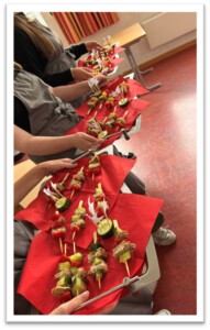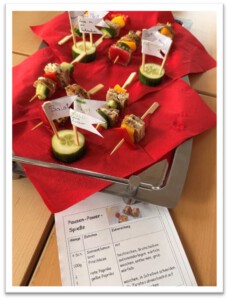 Im Rahmen der Woche der Gesundheit und Nachhaltigkeit bereiteten die 8. Klassen im Fach Ernährung und Soziales für die 5. Klassen ein gesundes Frühstück zu. Im Vorfeld informierten sich die SchülerInnen über eine abwechslungsreiche Auswahl von Lebensmitteln. Die bunten Pausen-Power-Spieße wurden im Anschluss zusammen mit einem Rezept zum Nachkochen erteilt.