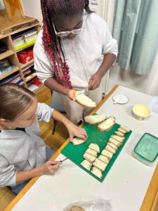 Bereits am Morgen herrschte in der Klasse eine freudige und geschäftige Stimmung. Gemeinsam bereiteten die Kinder ein vielfältiges Buffet mit frischen und möglichst unverpackten Lebensmitteln vor. Auf dem Tisch fanden sich unter anderem Vollkornbrot, frisches Obst und Gemüse, Aufstrich und Joghurt.