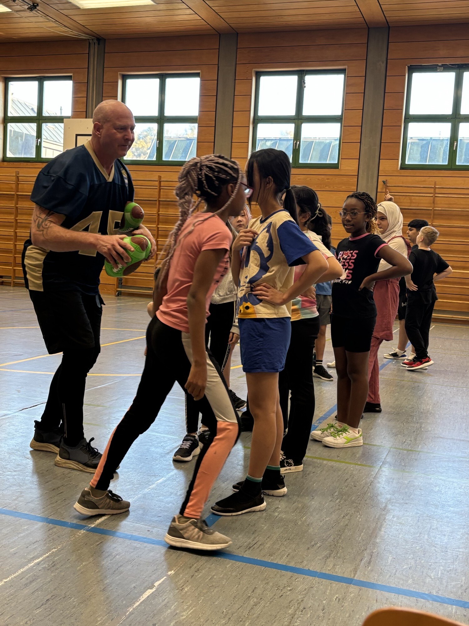So staunten sie nicht schlecht, als sie in der Turnhalle von einem imposanten Football-Profi empfangen wurden: Andreas Dietze, Schulbeauftragter beim American Football Verband Bayern e.V. war extra von München angereist, um zusammen mit seinem Kollegen Stephan Horrer, Trainer und Jugendleiter der Passau Pirates, die kontaktlose Variante des American Football vorzustellen.