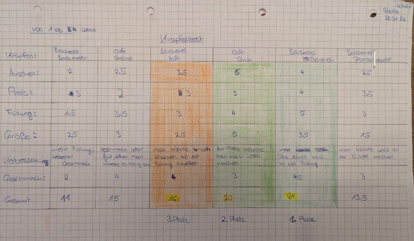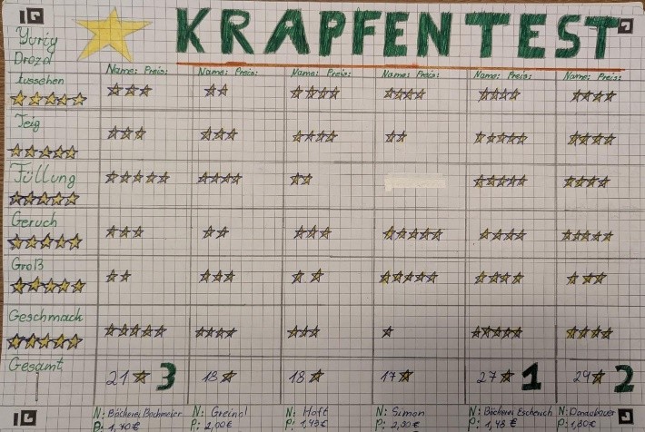Im Zuge des WiB Unterrichts wollte die 9MG-A Krapfen testen. Nachdem gemeinsam überlegt wurde, was einen „guten“ Krapfen ausmacht, legte die Klasse Kriterien fest. Diese wurden dann in Kleingruppen gewichtet und in einer Tabelle festgehalten. Insgesamt wurden so Krapfen von sechs unterschiedlichen Bäckereien und Konditoreien getestet. Das hat nicht nur Spaß gemacht und gut geschmeckt, sondern auch zu einigen neuen Erkenntnissen geführt: