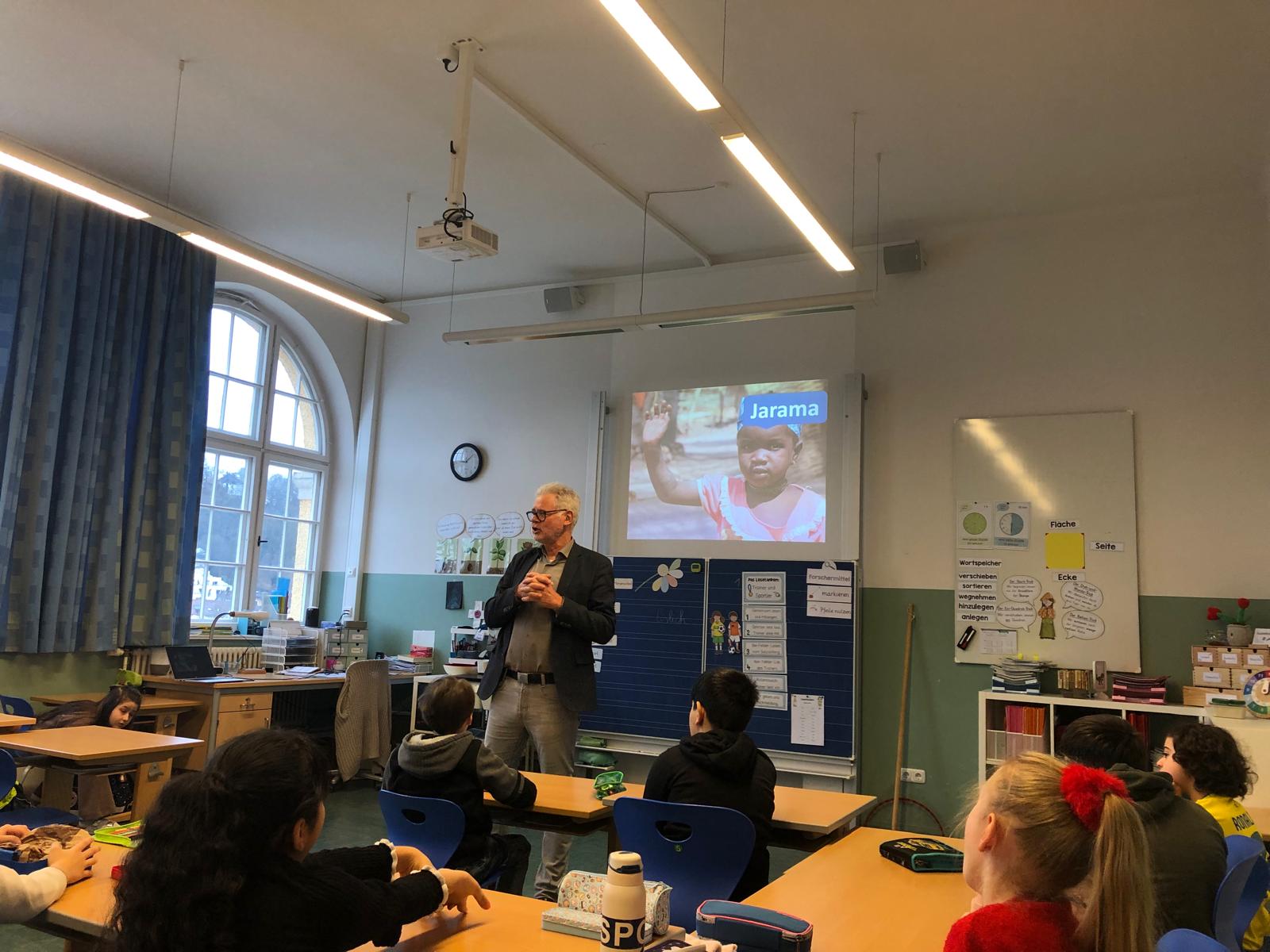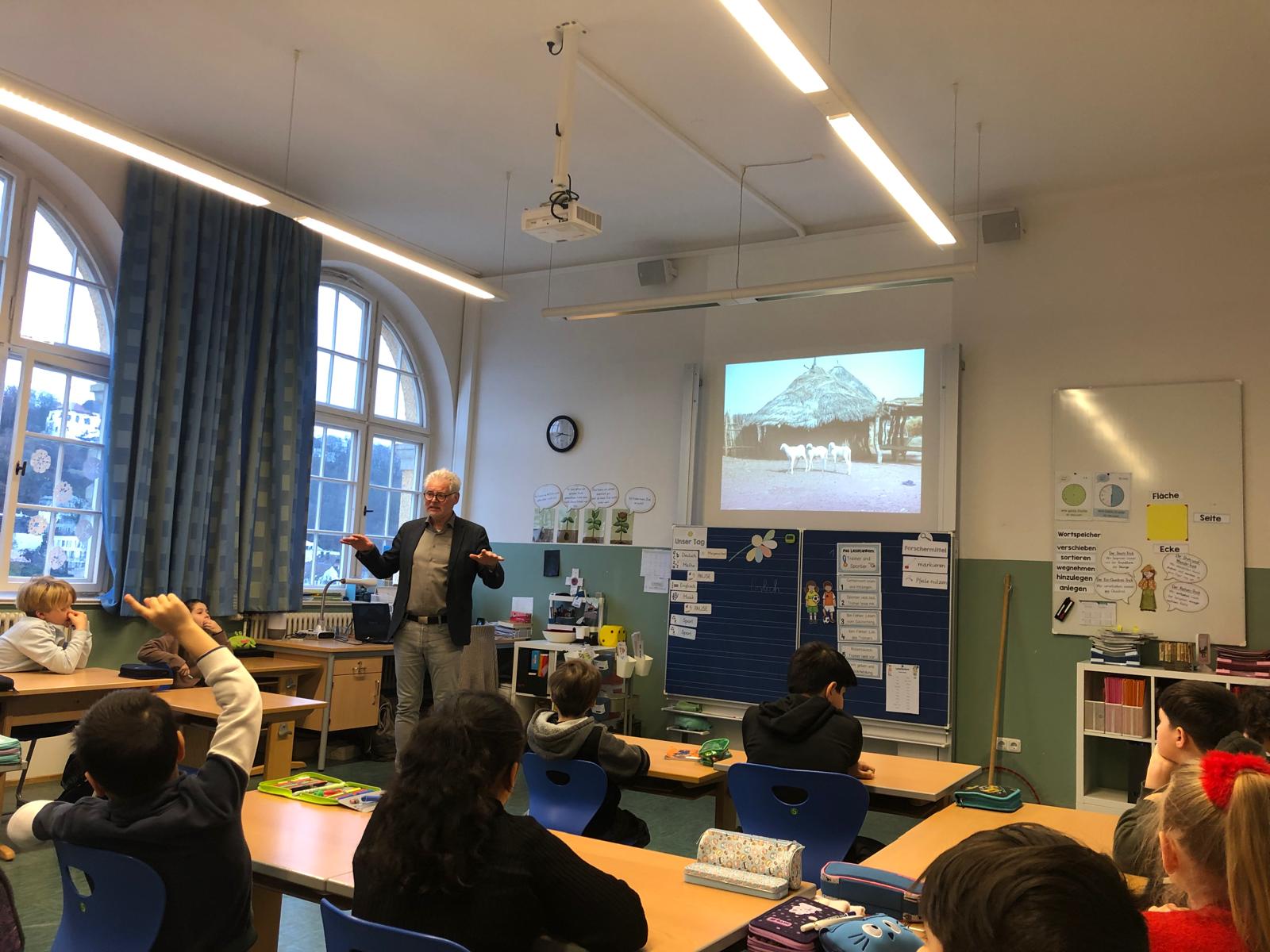 Mit zahlreichen Bildern, anschaulichen Erzählungen und persönlichen Erfahrungen vermittelte Rücker den Kindern ein lebendiges Bild vom Alltag im Senegal, dem westlichsten Land des afrikanischen Kontinents, das bis heute von seinem französischen Kolonialerbe geprägt ist. Dabei band er die Schülerinnen und Schüler aktiv in seinen Vortrag ein: Er stellte Fragen, ließ Vermutungen äußern und nahm sich viel Zeit für die zahlreichen und neugierigen Rückfragen. So entwickelte sich ein lebendiger Austausch, bei dem alle Beteiligten viel dazulernen konnten.