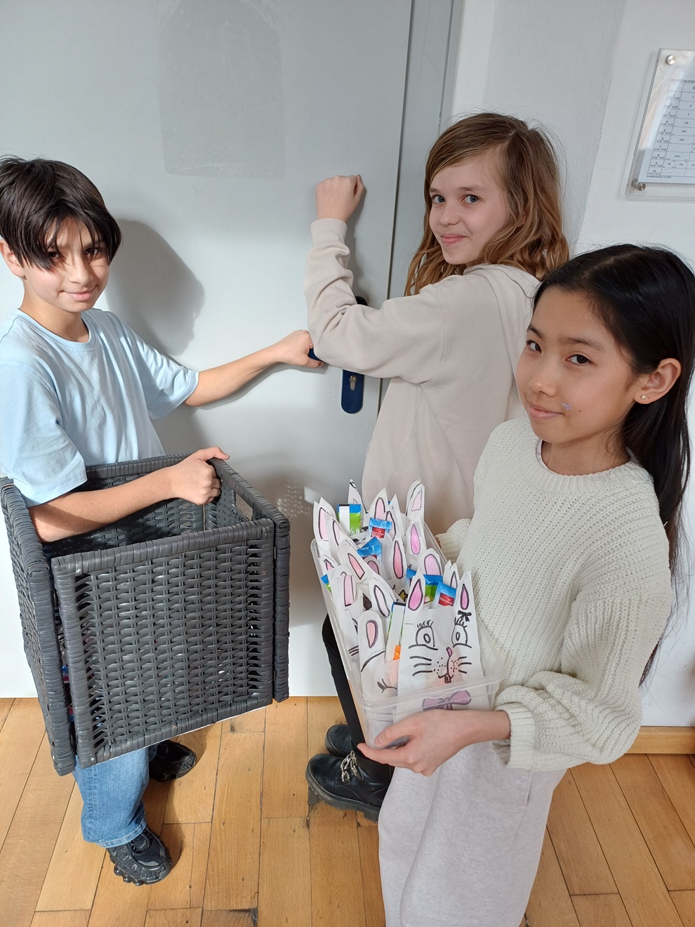 Alle Schülerinnen und Schüler der Klasse 5G-C waren äußerst engagiert und mit viel Freude dabei: Zuerst wurden kleinen Papiertütchen mit der Schere lange Ohren verpasst und mit bunten Stiften Hasengesichter aufgemalt. Anschließend sortierten die Kinder die Süßigkeiten und verteilten sie auf die vorbereiteten Tütchen. Schließlich wurden die Hasentütchen zugebunden beziehungsweise so vorbereitet, dass sie ausgeliefert werden konnten.