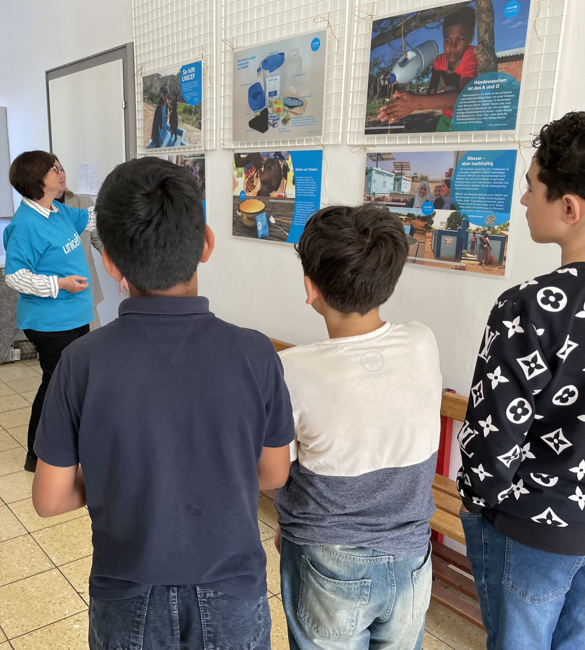 Beim Rundgang durch die Ausstellung erfuhren die Kinder auch, welche Maßnahmen UNICEF weltweit ergreift, um die Situation nachhaltig zu verbessern – etwa durch den Bau von Brunnen, die Bereitstellung von Hygieneeinrichtungen und Bildungsangebote rund um Wasser und Gesundheit.