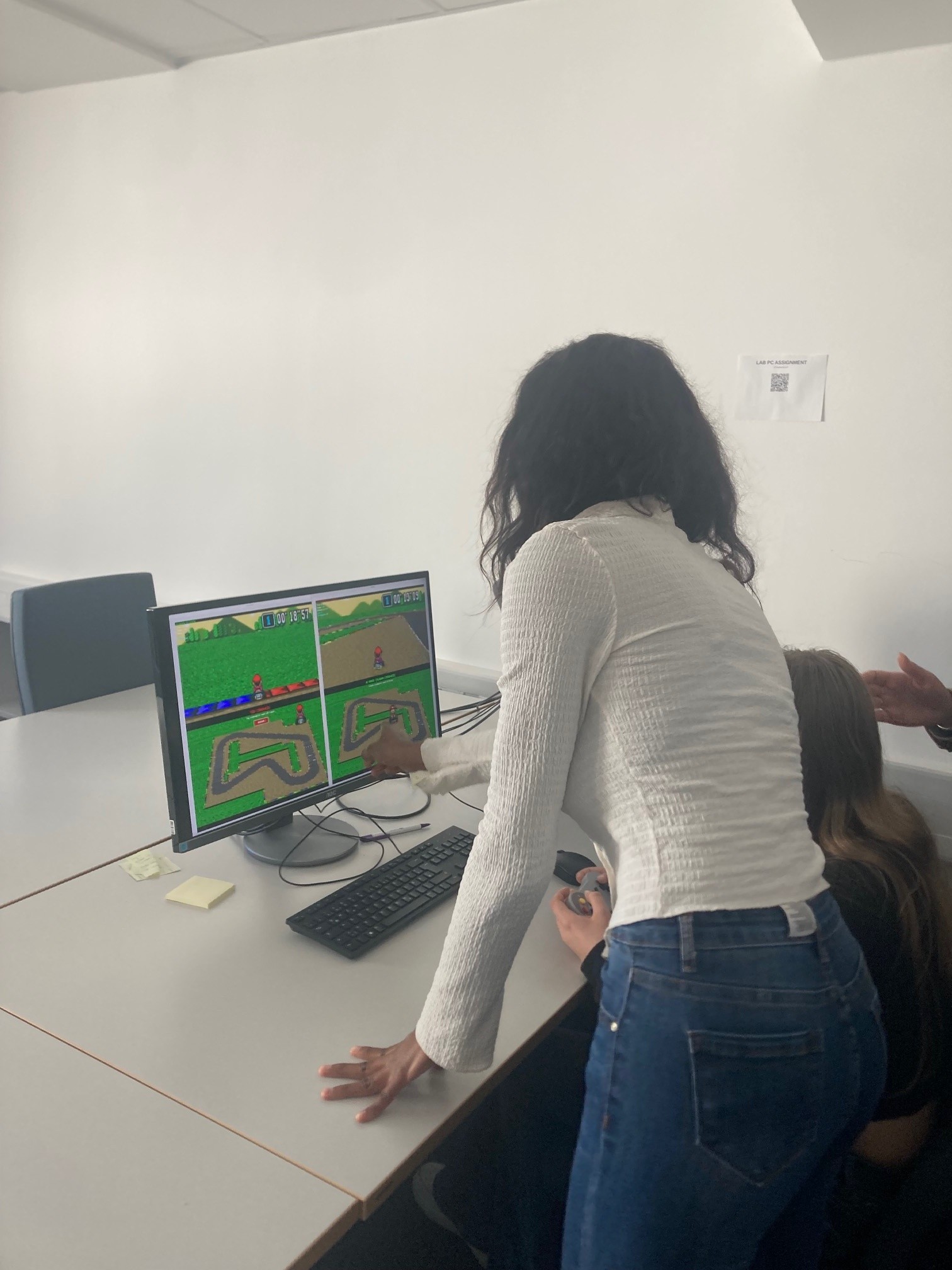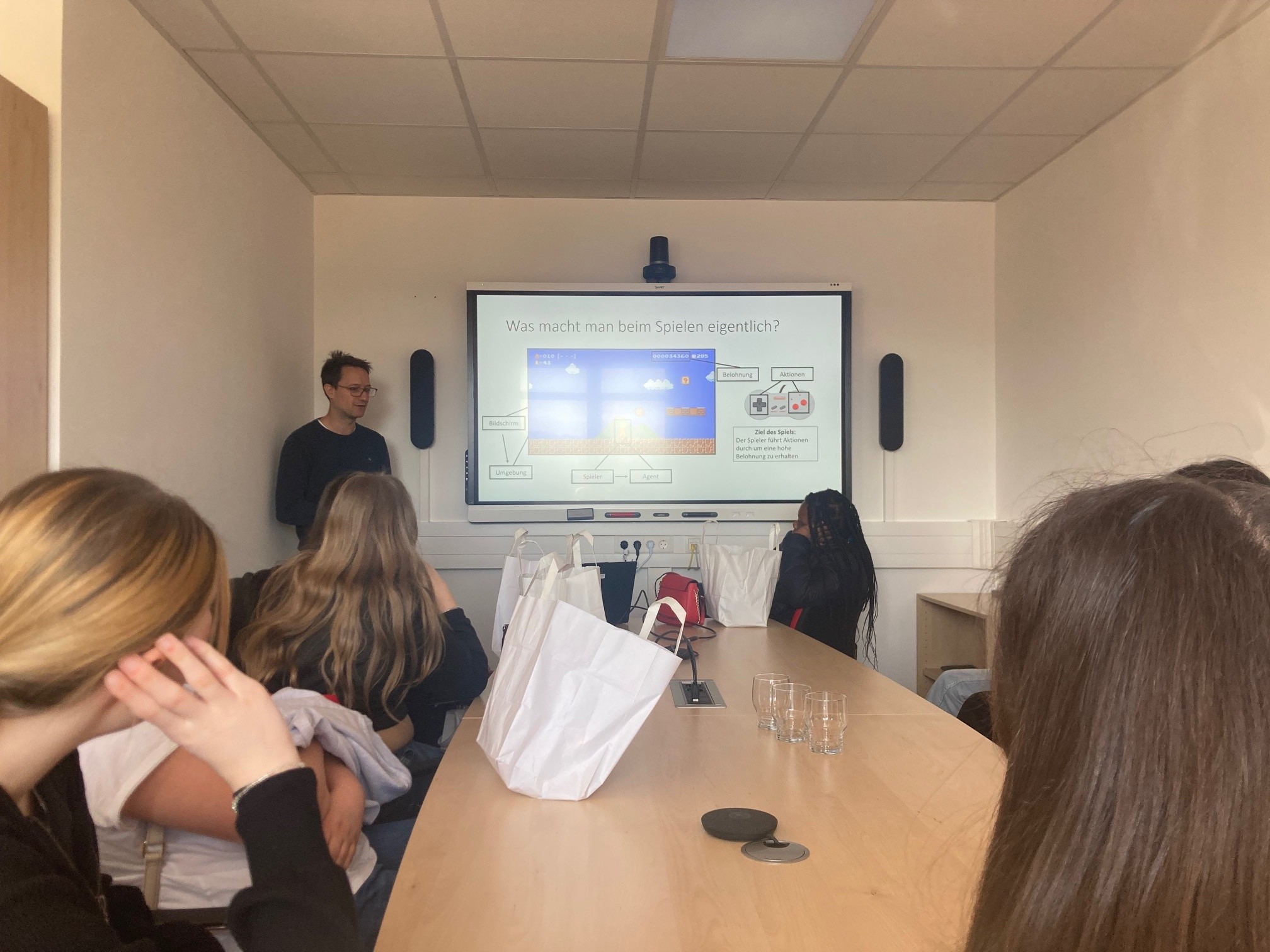 Anschließend erhielten die Schülerinnen der Mittelschule einen besonderen Einblick in die Welt der Künstlichen Intelligenz. Professor Dr. Steffen Herbold vom Lehrstuhl AI Engineering erklärte anschaulich anhand des Spiels Super Mario, wie KI funktioniert und worin sie sich vom Menschen unterscheidet. Besonders spannend war es, selbst gegen die KI zu spielen – einige Mädchen konnten sie sogar besiegen. Dies verdeutlichte, dass der Mensch durch Kreativität und Intuition der KI überlegen sein kann. Zudem erstellten die Schülerinnen Bilder mithilfe verschiedener Prompts und erkannten dabei die Bedeutung präziser Anweisungen.